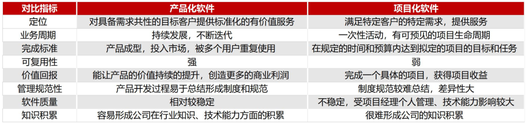 而产品化软件则是软件厂商开发出的对具备需求共性的目标客户群能提供标准化的有价值服务的产品,可复用性强,持续发展,不断迭代,发展过程中能让产品的价值持续提升。同时还具备管理规范性强、软件质量稳定、持续知识积累等优势。