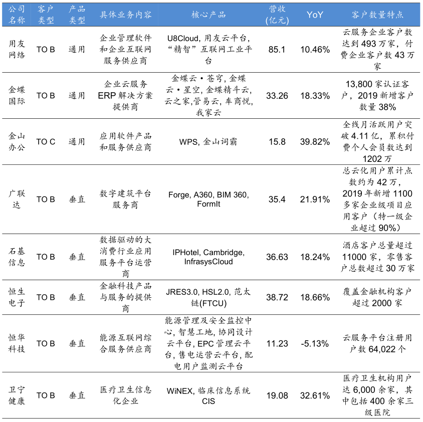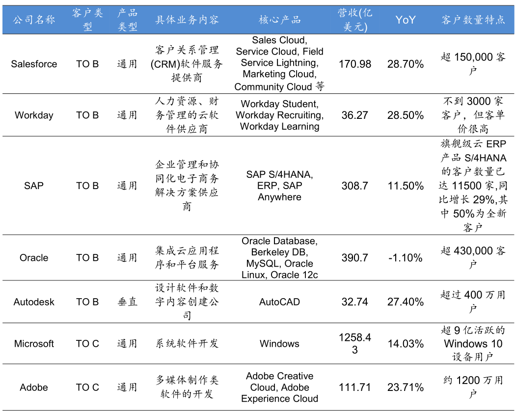 在这里需要补充说明的是,TO B类SAAS公司还可以将进一步分成通用型和垂直型。其中通用型公司解决的是某特定领域问题,可通用于多个行业;而垂直型公司则是针对某个行业的信息化需求,给出完整的解决方案,一般更聚焦于具体某个行业。