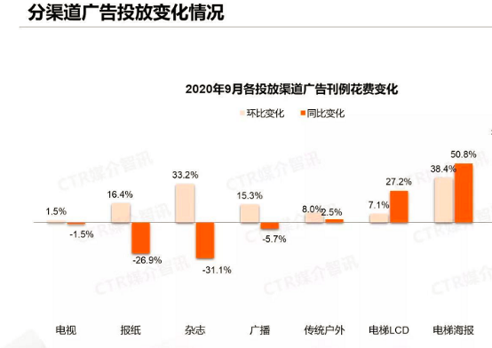 笔者认为,在当今碎片化时代,以分众为代表的全国性楼宇电梯媒介,最为符合以上引爆品牌的几个条件,称得上真正的中心化媒介。根据央视市场研究(CTR)数据,2020年9月全国投放广告的渠道中,电梯电视同比增长27.2%,电梯海报同比增长50.8%,远高于其他媒体。