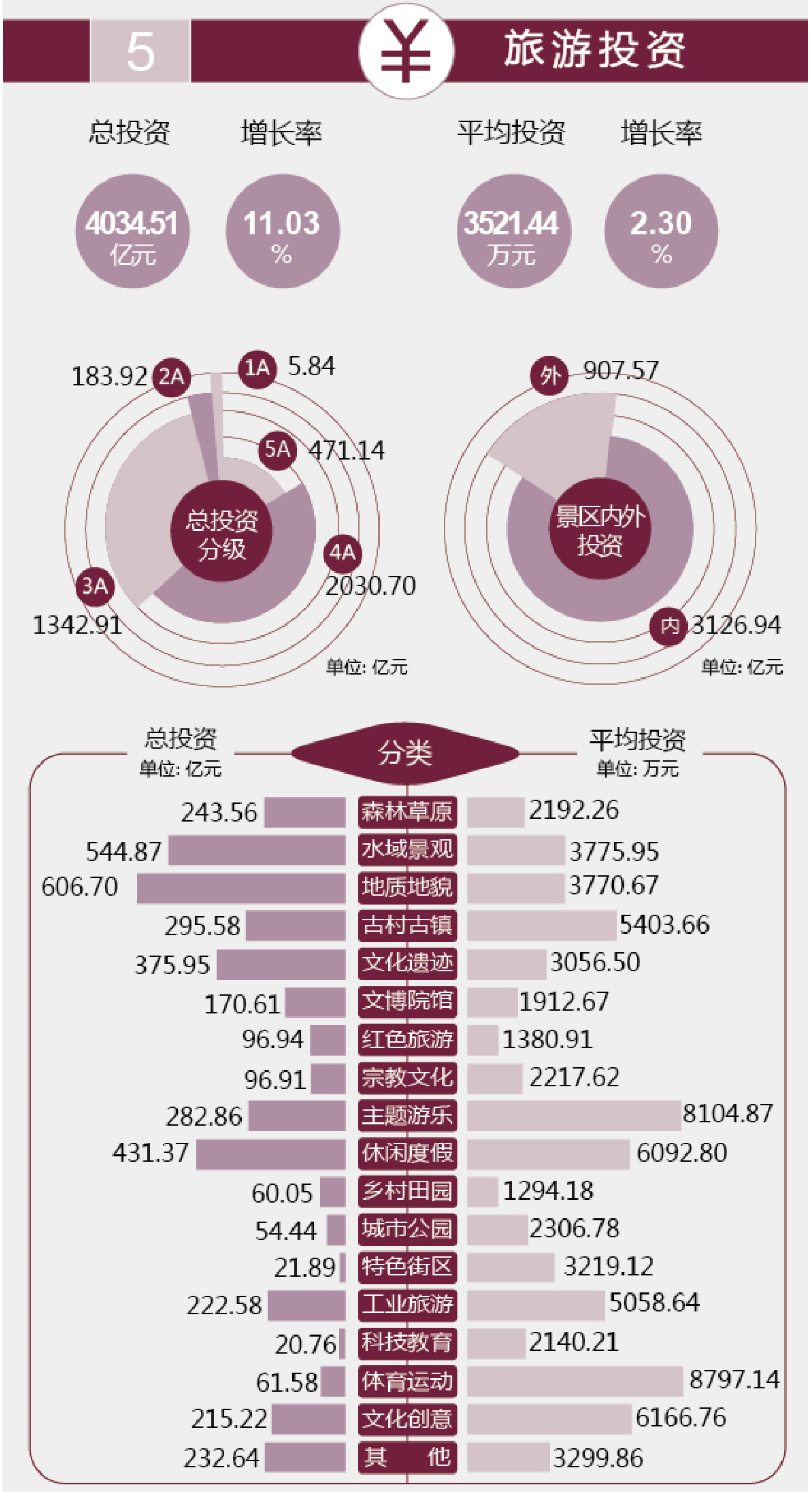 景区总收入5065.97亿元,增长率7.61%,其中,餐饮收入1477.77亿元,门票收入1217.65亿元,住宿收入1057.77亿元。游客接待量64.75亿人次,总游客量中41.19%属于免门票。旅游总投资4034.51亿元,增长率为11.03%。