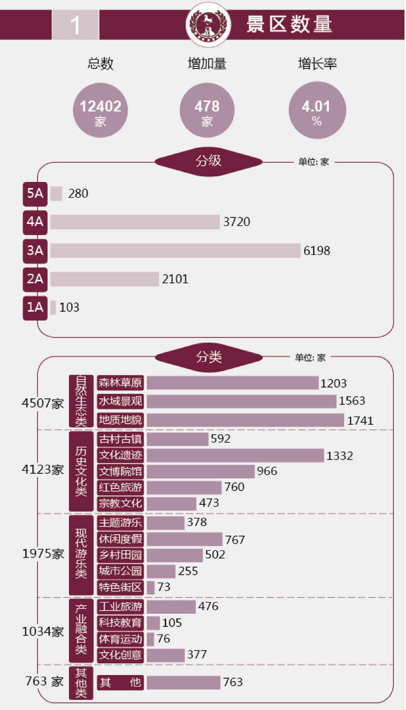 《中国旅游景区发展报告(2019-2020)便览》显示,我国共有景区12402家,其中,5A级景区280家,4A级景区3720家,3A级景区数量最多,达到6198家。自然生态类景区数量最多,4507家,其中,地质地貌类景区达到了1741家。历史文化类景区数量位列第二,共计4123家。