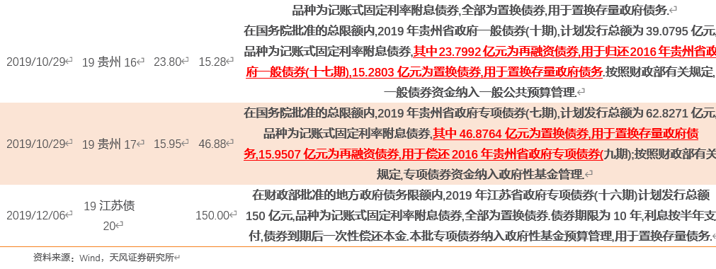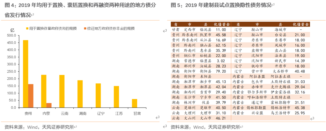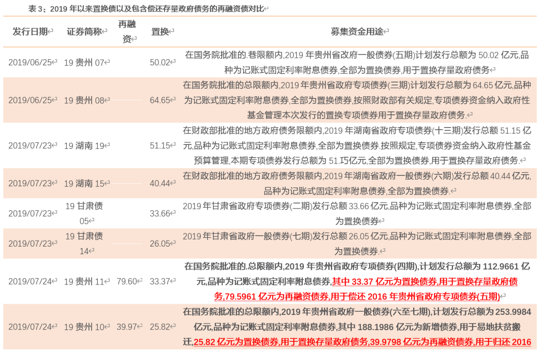 更进一步对比,2019年纳入建制县试点置换隐性债务的省份,其所发行的对应债券都是置换债(有捆绑发行情况,但是再融资部分明确是偿付地方债本金,置换债才是对应偿还地方政府债务),这一细微上的变化是否说明新的突破,无论是形式上还是范围上?