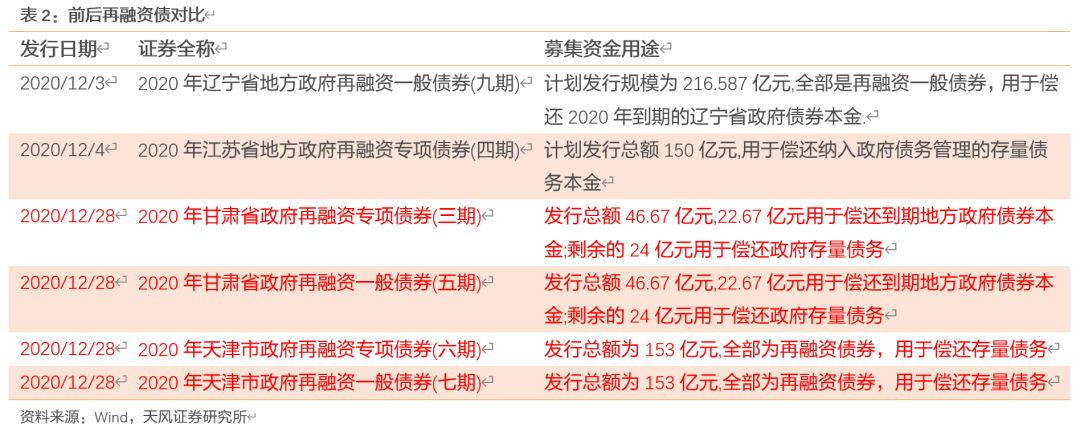 近日,在新下达的一批地方政府再融资债券中,其募集资金用途除了用于偿还到期地方政府债券本金之外,还有一部分用于偿还政府存量债务(20甘肃29、20甘肃30;20天津86、20天津87);由此联系到2019.12.24日21世纪经济报[1]道所提“在今年化解隐性债务的实践中,监管部分推出建制县隐性债务化解试点方案。具体而言,地方政府向监管部门上报方案,批准后即可纳入试点,纳入试点后可发行地方政府债券(省代发)置换部分隐性债务”来看,地方债试点置换隐性债务形式在突破,范围在扩大,值得关注。