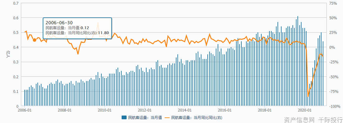 排除疫情的影响,航空客运量基本维持在5000万人次每月。