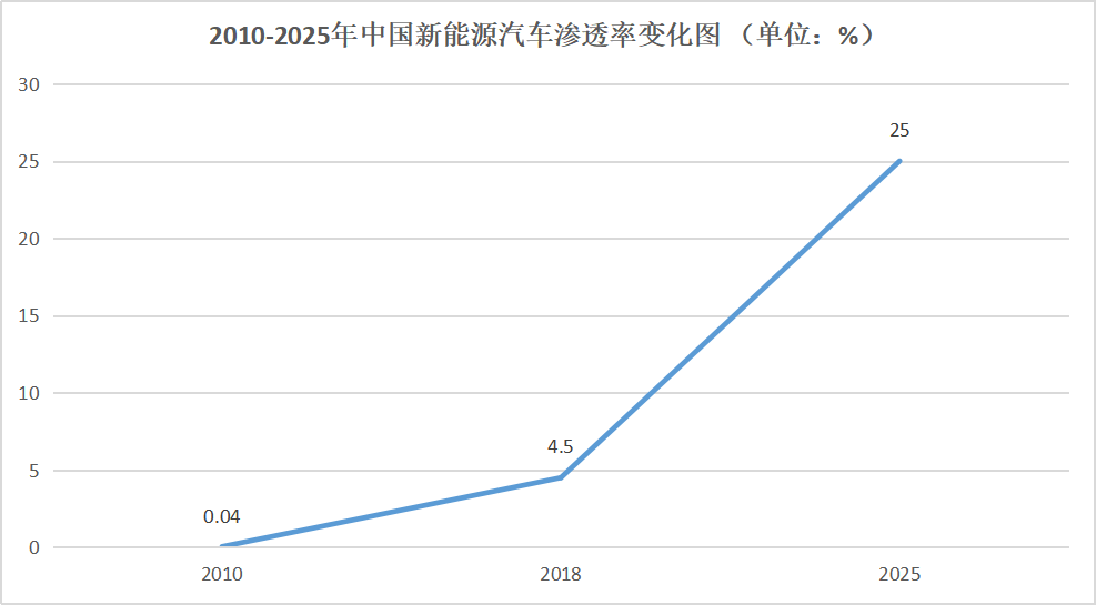 据恒大研究院发布的《2019中国新能源汽车发展报告》显示,2010年我国新能源汽车销量仅为8159辆,占全部汽车销量的0.04%。而到了八年后,我国新能源汽车的销量达到了125.6万辆,国内汽车市场的渗透率也达到了4.5%。而据德邦证券分析,预计到2025年这个渗透率将有望达到25%。