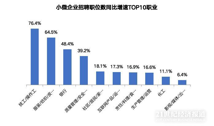 值得注意的是,技工、服装纺织等蓝领用工需求猛增。其中,对于采购与贸易、信托担保与拍卖典当、旅游度假与出入境服务职位,小微企业招聘职位数同比下降超过67%。而技工、服装纺织等蓝领职位分别同比上升76.4%和64.5%。