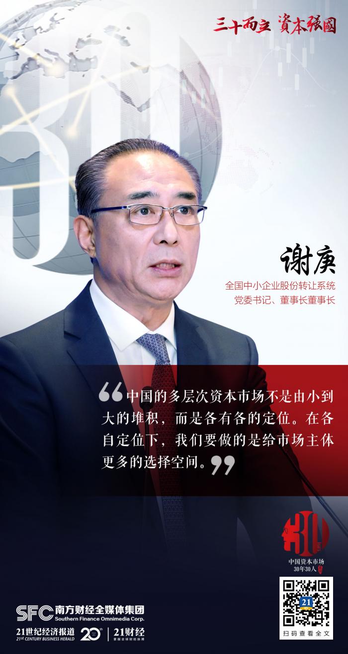 值中国资本市场发展30年之际,21世纪经济报道“中国资本市场30年30人”系列访谈,旨在对话亲历者、见证者,回顾过去,立足现在,展望未来。12月24日,21世纪经济报道特别对话全国股转公司董事长谢庚,分享他对多层次资本市场建设的理解,并深入剖析新三板在多层次资本市场的定位以及分层和转板制度为挂牌公司带来的机遇。