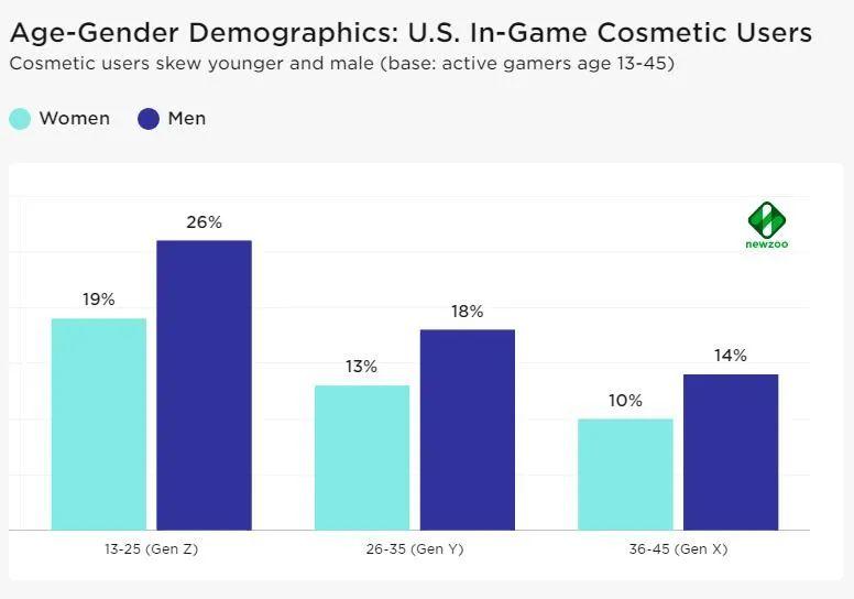 也正是由于皮肤在网游里的重要地位,因此有 43% 的美国活跃玩家表示,他们会在游戏中改变人物、武器以及坐骑的外观。Newzoo 的数据还显示,年轻玩家更喜欢在游戏中更换和使用皮肤,其中有 58% 为男性玩家。