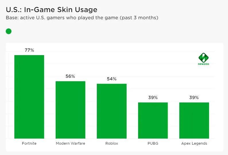 Dmarket 的创始人及 CEO Vlad Panchenko 表示:“游戏皮肤是目前大部分游戏中的关键系统。在利用皮肤与现实品牌和 KOL 进行联动方面,《堡垒之夜》无疑表现的相当出色。”Newzoo 的数据表明,在美国市场的头部 F2P 游戏中,《堡垒之夜》的皮肤系统使用率最高。