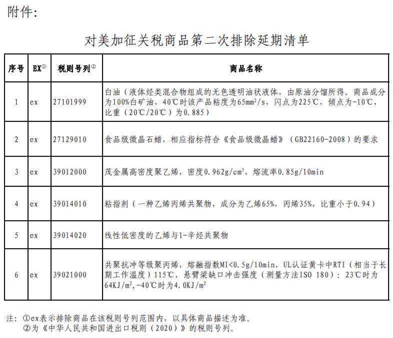经国务院批准,国务院关税税则委员会公布对美加征关税商品第二次排除延期清单,对《国务院关税税则委员会关于第一批对美加征关税商品第二次排除清单的公告》(税委会公告〔2019〕8号)中的6项商品,排除期限延长一年,自2020年12月26日至2021年12月25日,继续不加征我为反制美301措施所加征的关税。