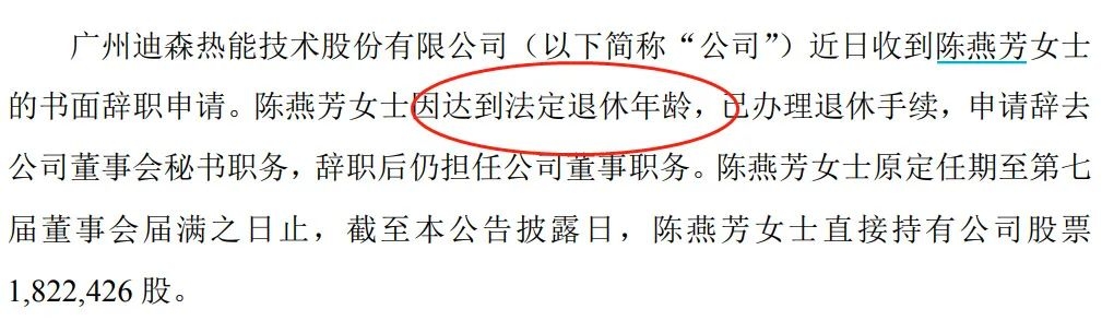 有意思的是,陈燕芳离职倒不是因为“个人原因”,而是达到退休年龄,办理退休手续。