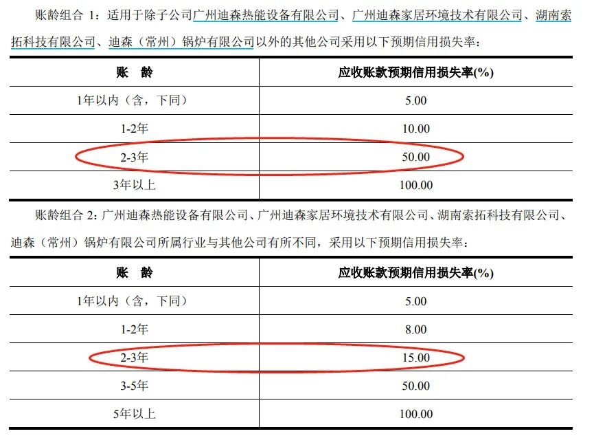 2020年半年报显示,迪森家居2-3年账龄的应收账款预期信用损失率是15%,而除了迪森家居、迪森热能共4家公司外,其他公司2-3年的应收账款的预期信用损失率是50%。