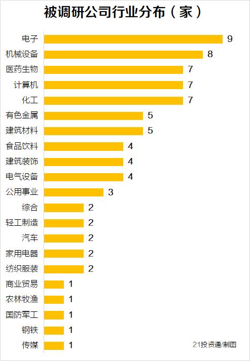 从行业分布来看,电子行业依旧最受机构青睐,高德红外(002414.SZ)、海康威视(002415.SZ)、北京君正(300223.SZ)等9家相关公司被调研,其次是机械设备、医药生物、计算机、化工行业,均有7家或以上公司获调研。