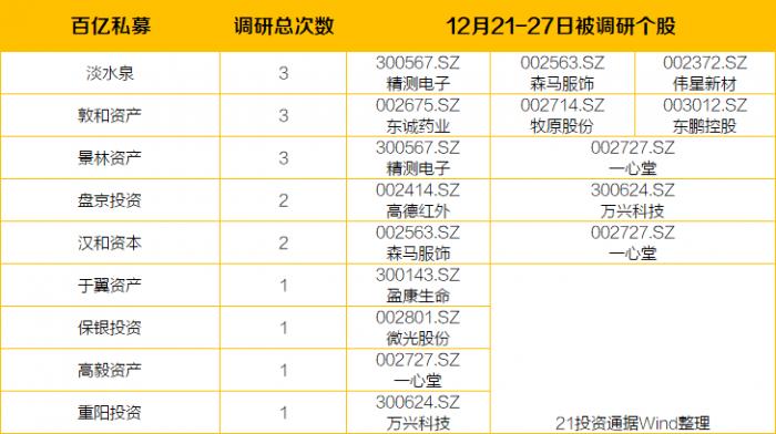 而具体调研机构来看,淡水泉、敦和资产、景林资产、盘京投资、高毅资产等9家百亿知名私募调研了11家公司。其中,淡水泉与景林资产共同调研了精测电子,与汉和资本共同调研了森马服饰,一心堂则获得了景林资产、汉和资本、高毅资产3家百亿私募的青睐。