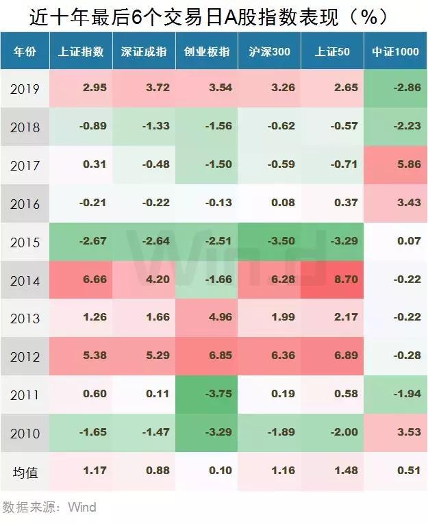 Wind统计显示,过去十年的最后6个交易日中,A股同期行情以上涨居多,但呈现结构性分化的特征。其中代表大盘股的上证50指数上涨概率达六成,平均涨幅为1.48%。代表小市值个股的中证1000指数上涨概率仅为四成,平均涨幅为0.05%。