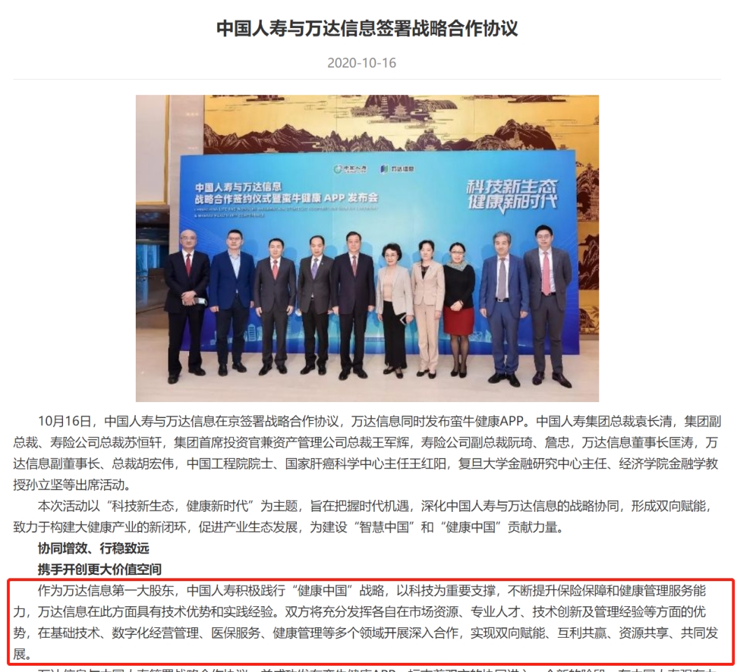 但中国人寿和和谐健康今年却先后举牌万达信息,且中国人寿还是万达信息第一大股东。中证君注意到,在中国人寿官网的公司新闻中,有如下一段描述,“中国人寿积极践行健康中国战略,以科技为重要支撑,不断提升保险保障和健康管理服务能力,万达信息在此方面具有技术优势和实践经验。双方将充分发挥各自在市场资源、专业人才、技术创新及管理经验等方面的优势,在基础技术、数字化经营管理、医保服务、健康管理等多个领域开展深入合作,实现双向赋能、互利共赢、资源共享、共同发展。”