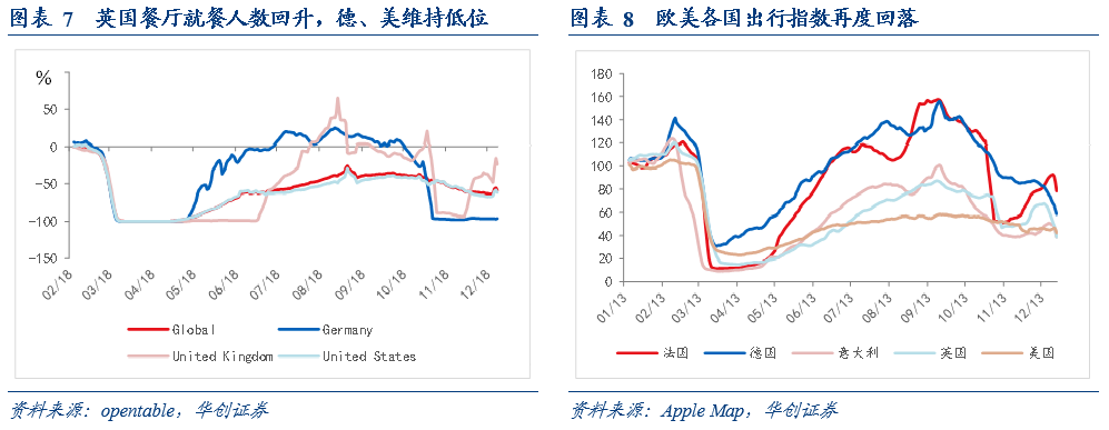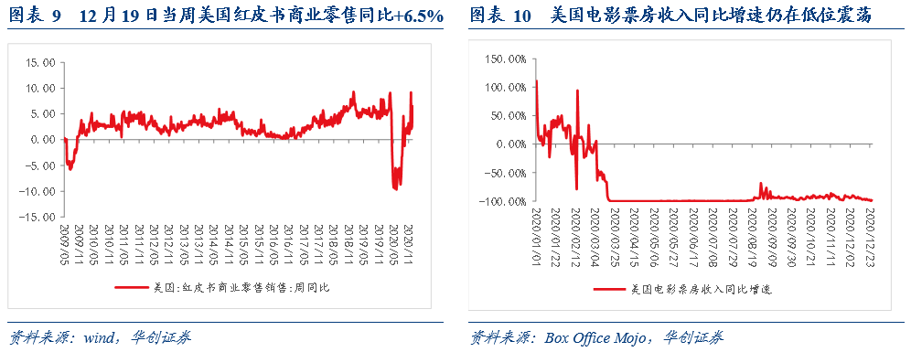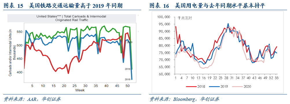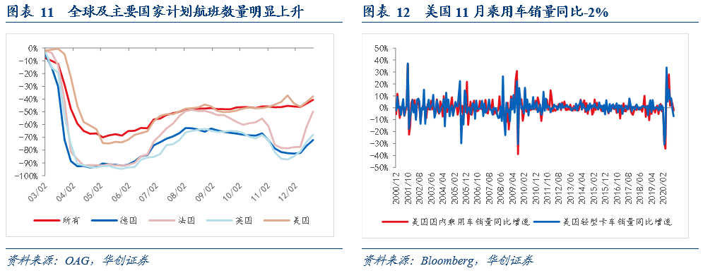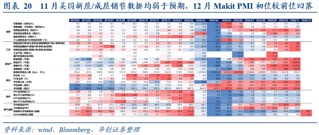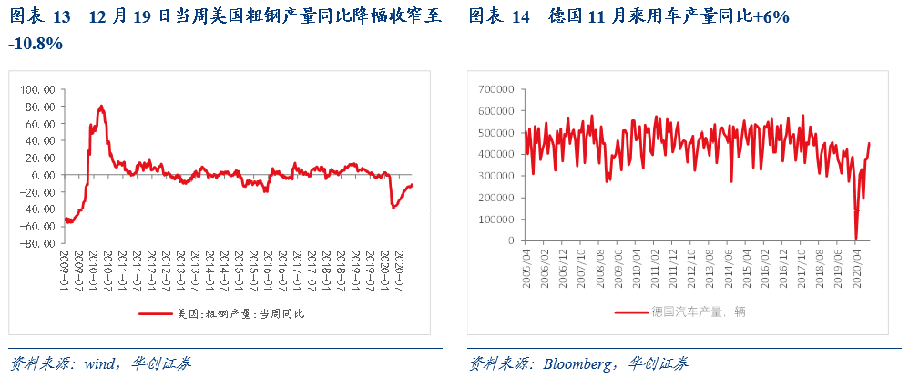 工业生产方面:目前美国用电量与去年同期水平基本持平,铁路运输量高于2019年同期,工业生产活动大致稳定,12月Markit制造业PMI初值56.5,较前值56.7略有回落。德国11月乘用车产量同比+6%,欧元区12月制造业PMI初值较11月改善,录得55.5,前值53.8,欧元区12月制造业前景预期优于美国。