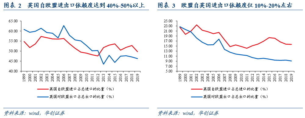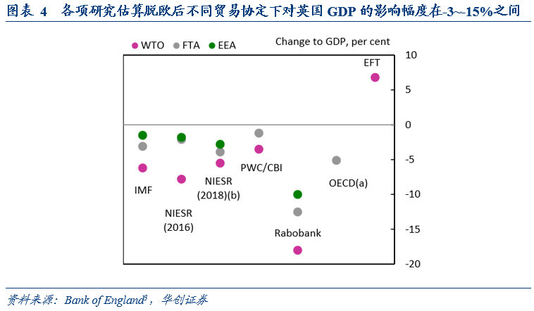 脱欧对英国经济的冲击大于欧盟,达成脱欧协议后,对英国经济的冲击将显著减弱。由于英国自欧盟进出口依赖度达到40%-50%以上,而欧盟自英国进出口依赖度仅10%-20%左右,因此可见脱欧对双方经贸关系的冲击对英国的冲击会更大。此前,大量学术研究在假设英国脱欧后,与欧盟维持WTO、FTA(英国和欧盟达成标准自由贸易协定)、EEA(英国脱欧后保留关税同盟成员资格)三种经贸关系的情境下,对英国经济的冲击;根据英国央行的汇总,各项研究估算脱欧后在FTA协定下对英国GDP的影响幅度在-3%左右,在WTO协定下对英国GDP的影响幅度在-4%至-8%左右,FTA情景下对英国经济的冲击将显著弱于WTO情景。目前英国与欧盟双方达成自由贸易协定(FTA),因此脱欧协议达成后对于英国与欧盟之间4400亿欧元/年的商品贸易将带来一定的呵护作用。
