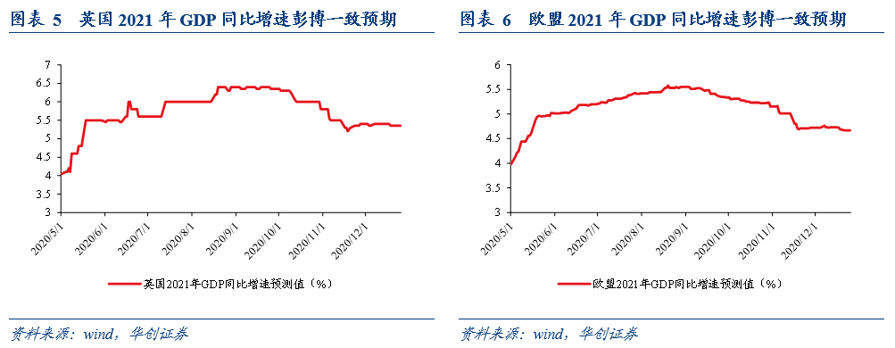 不过此次协议中未涵盖外交、外部安全与国防合作领域的问题;在英国脱欧后将不再享有欧盟成员国和欧盟单一市场、关税同盟的优势;英国与欧盟之间人员,货物,服务和资本的自由流动将结束;同时此次协议对服务贸易,包括金融服务业的保障较少。因此即便双方达成协议,但短期对英国经济的冲击仍难以避免。11月以来市场对英国与欧盟2021年GDP增速大幅下修,而脱欧带来的冲击对本已疲弱的欧洲经济将带来进一步的冲击。