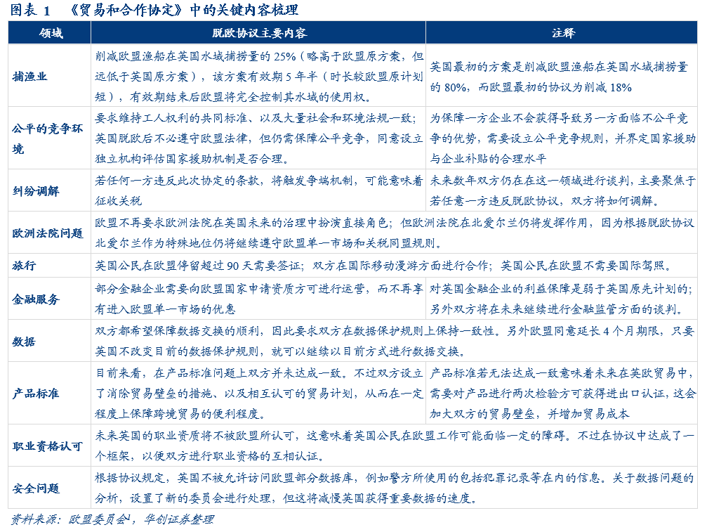 具体内容详见华创证券研究所12月27日发布的报告《【华创宏观】英欧《贸易和合作协定》达成,主要内容有哪些?——海外周报第35期》。
