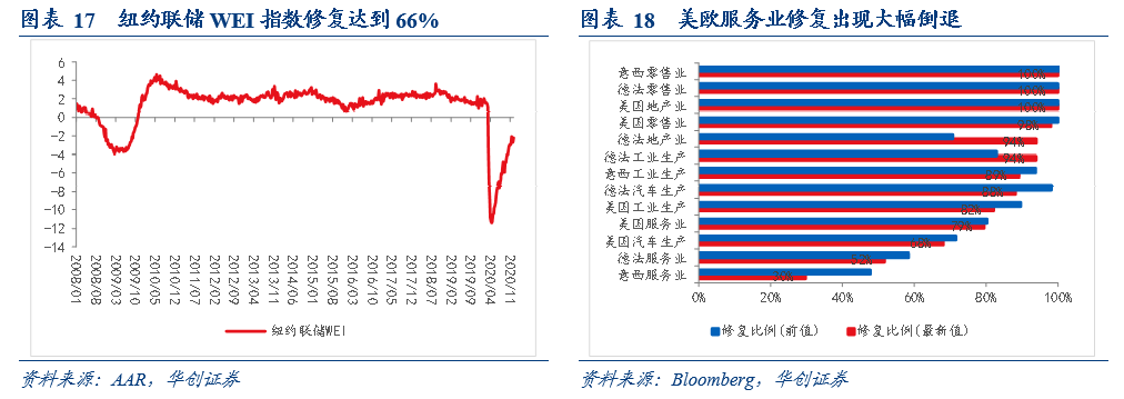 纽约联储WEI指数修复程度达到66%,但近期该指数回升趋势出现波动,反映美国经济在冬季疫情再度爆发后经济修复的趋势受到一定冲击,修复速度出现反复。而根据我们对各国经济各部门修复程度的估算,欧美冬季疫情以来,服务业出现显著倒退,工业生产修复程度略有下滑,不过美国地产业、欧美零售业依旧强劲,均恢复到疫情前水平。
