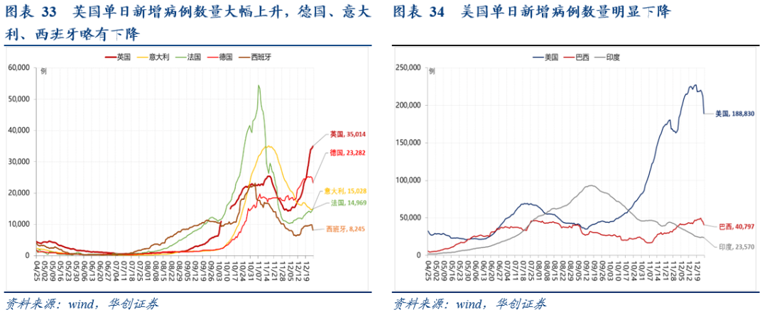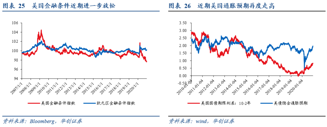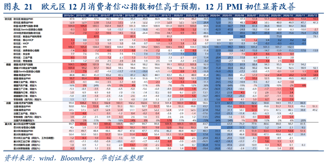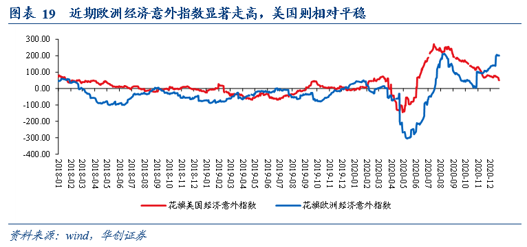 美欧对比来看,近期欧洲在疫情防控相对美国更为有效的背景下,经济意外指数显著走高,同时欧元区12月制造业与服务业PMI环比11月均有显著改善,相对而言美国疫情依旧严峻,且PMI数据显示经济前景在走弱,因此美欧经济目前呈现欧洲相对强于美国的格局。