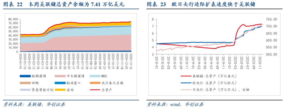 本周美联储总资产环比回升1199.2亿美元,总资产规模达到7.41万亿美元,扩表速度大幅提升,主要的扩表因素以国债和MBS为主,环比分别增长322.7、754.4亿美元,另外主街贷款计划与市政流动性便利工具本周规模也大幅提升,环比分别增长26.9、49.1亿美元,带来美国金融条件近期进一步放松。