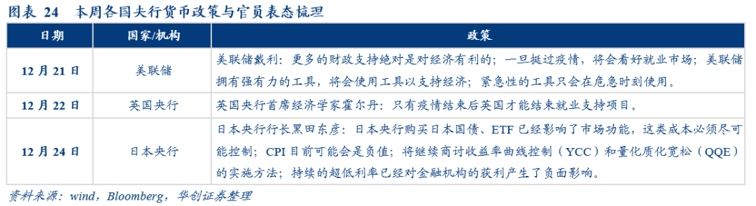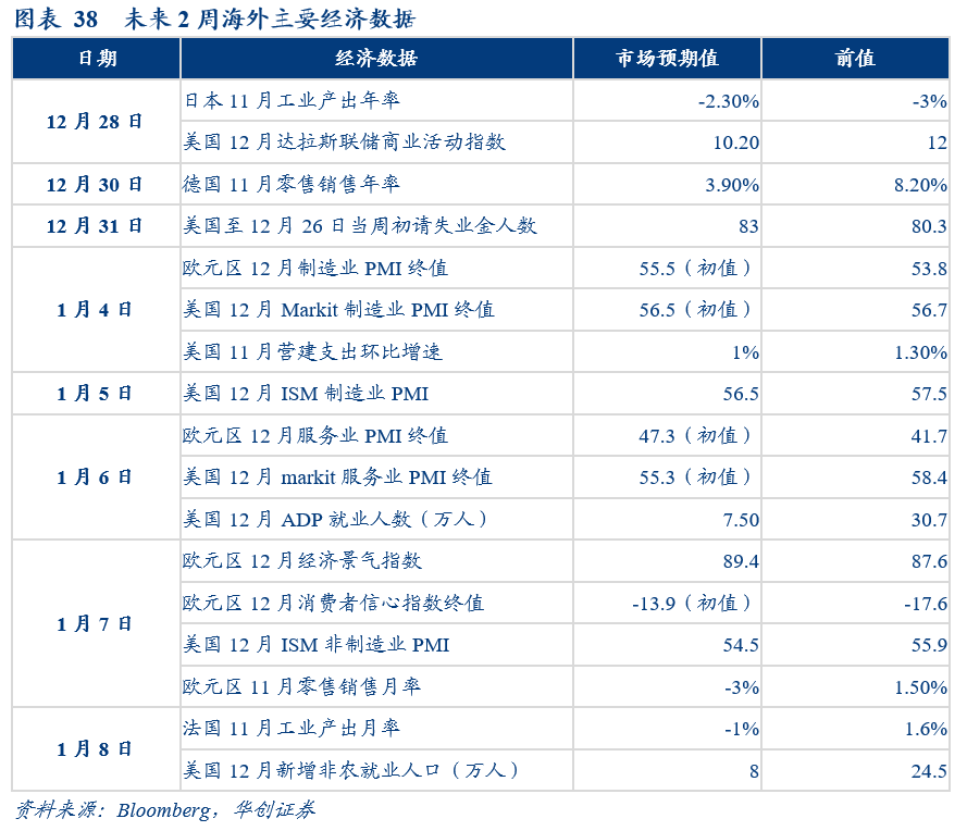 未来2周海外重点数据包括:1)各国12月PMI数据终值;2)美国12月新增非农就业,预计受美国疫情持续发酵影响,新增非农就业人数增速将进一步放缓;3)欧元区及主要欧洲国家11月零售销售、工业产出数据,受欧洲疫情带来的二次封锁影响,各项数据均出现恶化;4)欧元区12月经济景气指数、消费者信心指数。