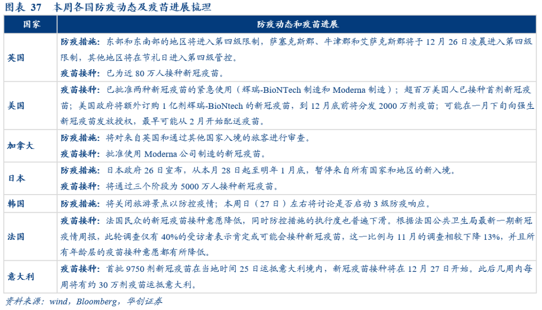 多国新冠疫苗获批和接种工作逐步推进,法国民众接种意愿降低。美国、英国新冠疫苗接种工作稳步推进,爱尔兰、意大利等国即将开始接种,加拿大批准使用Moderna公司制造的新冠疫苗,日本也预计将逐步为5000万人接种新冠疫苗。但根据法国公共卫生局最新一期新冠疫情周报,法国民众的新冠疫苗接种意愿降低,防控措施的执行度也普遍下滑。此轮调查仅有40%的受访者表示肯定或可能会接种新冠疫苗,与 11月的调查相较下降13%,且所有年龄层接种意愿均下降。