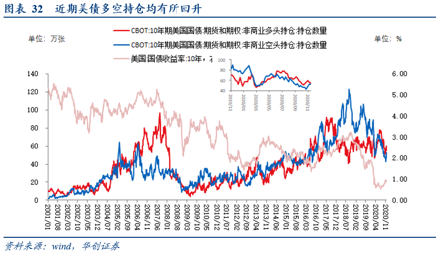 近期美债隐含通胀预期再度走高,带来美债期限利差进一步走阔,同时10年期美债收益率触及1附近,近期呈显著提升。近期在疫苗开始接种,美国9000亿财政刺激政策落地的影响下,经济乐观预期有所提升;但同时美联储依旧维持宽松立场,在近两周加大了购债速度,对美债收益率上行或形成一定压制。近期美债多空持仓仍在低位,但均有所回升,或也反映市场对美债交易前景的不确定性。