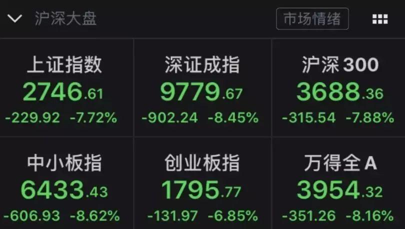 上证指数跌7.72%,深证成指跌8.45%,创业板指跌6.85%。还有3209只个股跌停。
