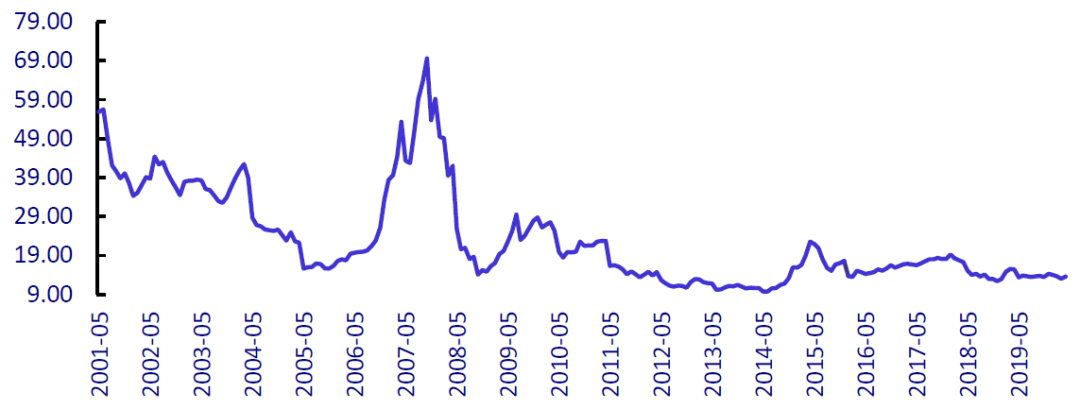 上证a股市盈率(2001-2019年)