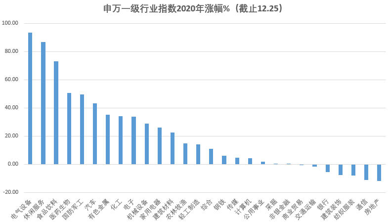 电气设备、休闲服务、食品饮料、医药生物分别上涨93.48%、86.73%、73.17%、50.6%;