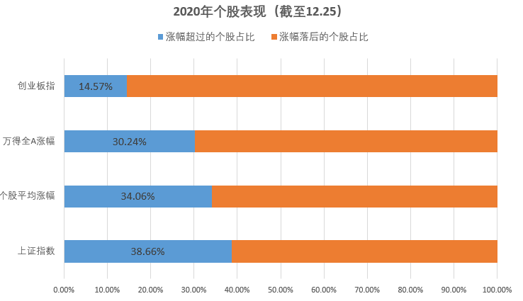 也就是说,有近一半的个股在2020年是下跌的。