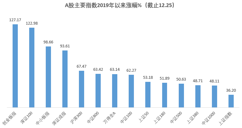 从2019年初算起,A股已经连续走了两年牛市。截至12月25日,拉出2019年以来A股各大指数的走势,创业板指、深证100涨幅都已经翻倍,中小板指和深证成指也接近翻倍。