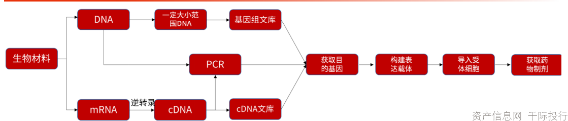 胞内复制、转录、翻译和表达,最终制成目的生物制剂。自1982年重组胰岛素批准上市以来,现已有近40种基因工程药物投放市场, 包括胰高血糖素、生长激素、EPO、G-CSF、a-IFN、疫苗、单克隆抗体等。基因工程技术开发药物包含四个步骤:1) 目标基因片段的获得:可以通过化学合成的方法合成已知核苷酸序列的DNA片段, 也可以通过从生物组织细胞中提取分离得到;2)将获得的目的基因片段扩增后与适当的载体连接后,再导入适当的表达系统;3)在事宜的培养条件下,使目的基因在表达系统中大量表达目的药物;4)将目的药物提取、分离、纯化,最后制成相应的制剂。胰岛素、生长素、干扰素、单克隆抗体、疫苗、血液因子VII等均是基因工程生物制品。