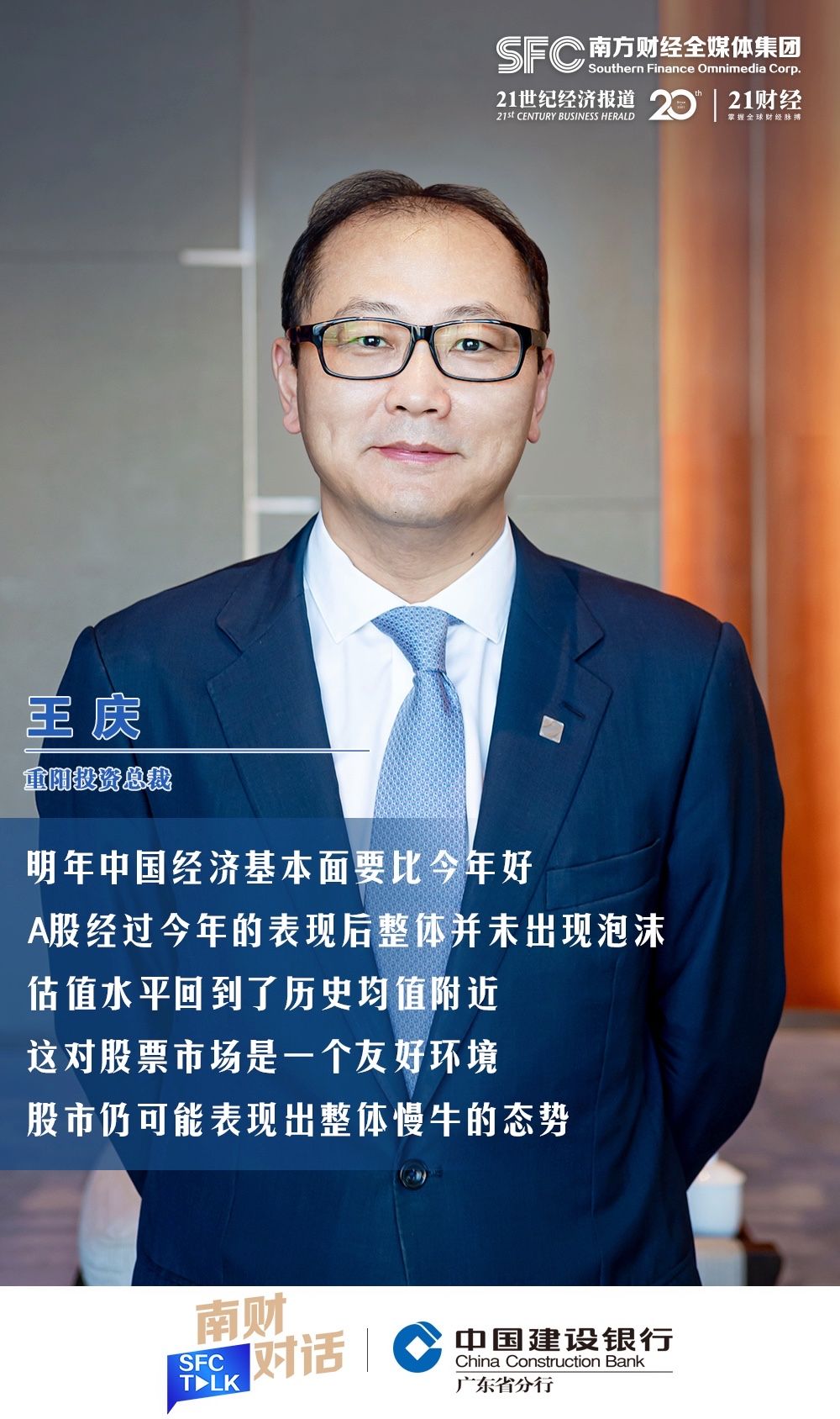 王庆:明年A股也一样要反映经济基本面。明年中国经济基本面要明显比今年要好,同时,A股尽管经过今年以来的表现,整体上估值水平并没有出现泡沫,估值水平回到了历史均值附近。估值相对合理,基本面修复,这样一个环境应该说对股票市场是一个友好的环境,因此,股票市场仍然可能会表现出整体慢牛的态势,这是一方面。另一方面,今年股票市场的表现是具有非常明显的结构性特征的,明年股票市场的表现仍然会表现出非常突出的结构性特征。而这种结构性特征明年可能跟今年就不太一样了。因为今年更多是流动性驱动的,明年更多是业绩驱动的。流动性驱动和业绩驱动对股票不同板块的表现的相对影响是不一样的。所以我们期待明年的股票市场整体表现,但也要注重抓住这个新的结构性的机会,规避新的结构性风险。