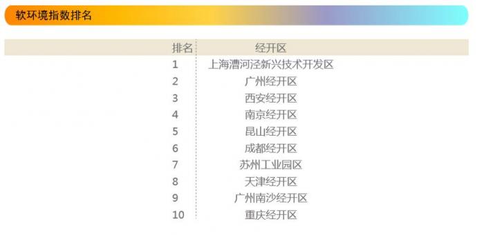 从结果来看,上海漕河泾新兴技术开发区、广州经开区、西安经开区、南京经开区、昆山经开区、成都经开区、苏州工业园区、天津经开区、广州南沙经开区、重庆经开区位列软环境的前十位。