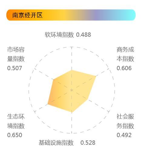 具体来看,南京经开区在软环境指数中得分位列第4,社会服务指数第5,基础设施指数第8,市场容量第9,生态指数第11,商务成本指数第20。软环境、社会服务指数、商务成本和市场容量分别比去年上升了5位、6位、3位和1位,基础设施和生态环境则下降1位和2位。