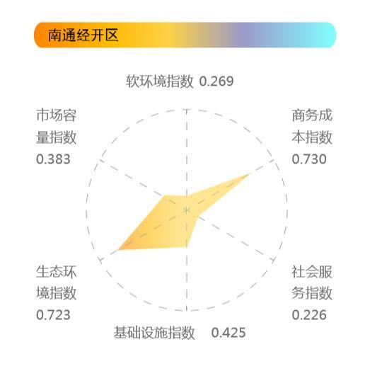 根据报告测算,南通经开区营商环境指数位列全国第17名。其中,生态环境指数得分在30个国家级经开区中居第5位,商务成本指数居第7位,基础设施指数居第15位,市场容量指数居第18位,软环境指数居第26位。