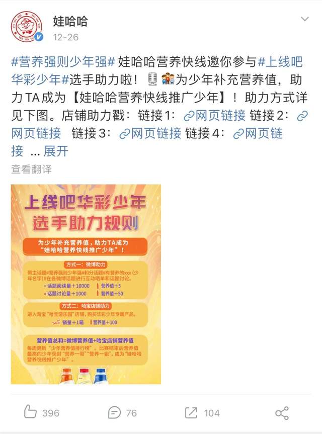 网友正捂着眼睛表示被娃哈哈土到,网娱君又去研究了一下,发现娃哈哈的文案大多如此:在打投的话题上,选手们被冠上“有营养的XXX”名号。节目的slogan也是“营养强则少年强”。(娃哈哈,钱都用来冠名了?可以留点预算请个好的广告设计吗?