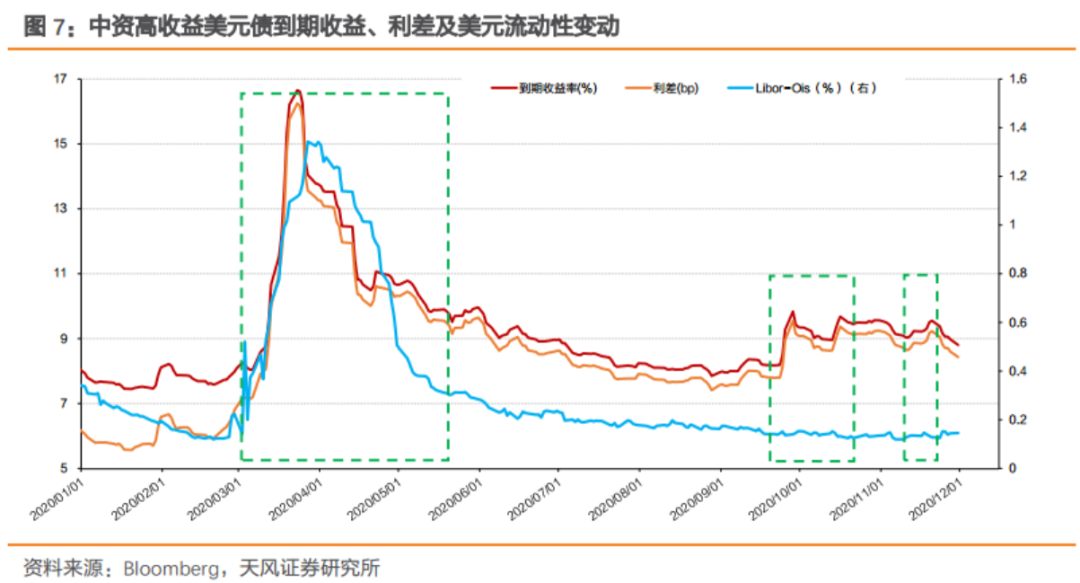 第一次冲击,2020年初疫情全球蔓延下的美元流动性冲击。中资美元债的定价同时受到国内信用基本面、美元流动性和汇率等因素的影响,年初疫情在全球快速蔓延,造成美元流动性明显紧张,3个月美元Libor-OIS息差快速上行至2008年全球金融危机后的最高值。而受此影响,中资美元债一级市场发行量明显减少,二级市场价格出现明显下跌。尤其是以房地产企业为代表的高收益中资美元债价格出现明显下跌。中资投资级债券的收益率和利差也出现阶段性上行,但是上行幅度明显低于高收益级债券。