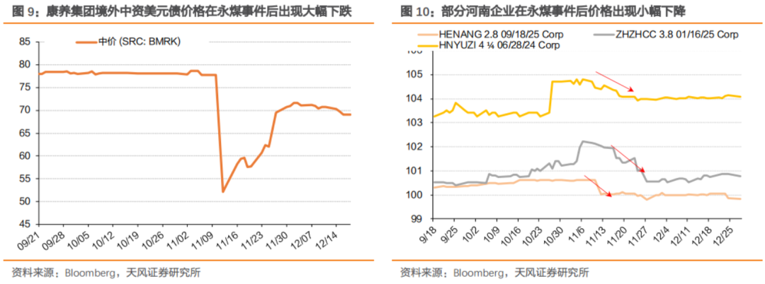 永煤控股及其母公司豫能化在境外没有存续美元债,因而其对中资美元债的影响主要体现在市场情绪上。从11月10日永煤违约开始,中资高收益债收益率最高上行52bp,利差最高上行58bp。另外,由于永煤违约前是AAA评级的国企,因而其违约对中资投资级债券也产生了小幅冲击,其收益率和利差分别在两周内上行8bp和12bp。