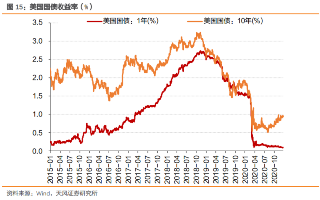 美债利率面临上行的压力。随着生产的逐渐恢复,以及疫苗带来的情绪提振,美债利率持续上行,目前美国十年国债利率已经上行至接近1%的水平,美债利率曲线明显陡峭化。