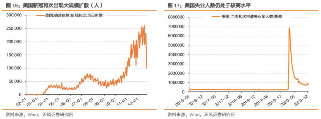 但目前经济恢复和疫苗接种仍有较强的不确定性。近期海外疫情再次出现了大规模扩散,美国单日新增感染新冠病毒的患者人数再次创新高,超过25万人;此外,具有更强传染性的变异病毒出现,进一步加剧了疫情可能带来的不确定性。尽管近期海外有疫苗开始接种,但是要达到全民免疫需要一个过程,而疫苗对变异病毒的有效性尚待检验。