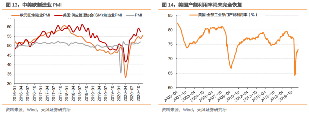 海外生产在持续恢复中。美国当周初次申请失业金人数仍处于较高水平,但是制造业仍处于恢复过程中。以产能利用率为例,美国11月份全部工业部门产能利用率为73.31%,相比于疫情初期已经有明显好转。