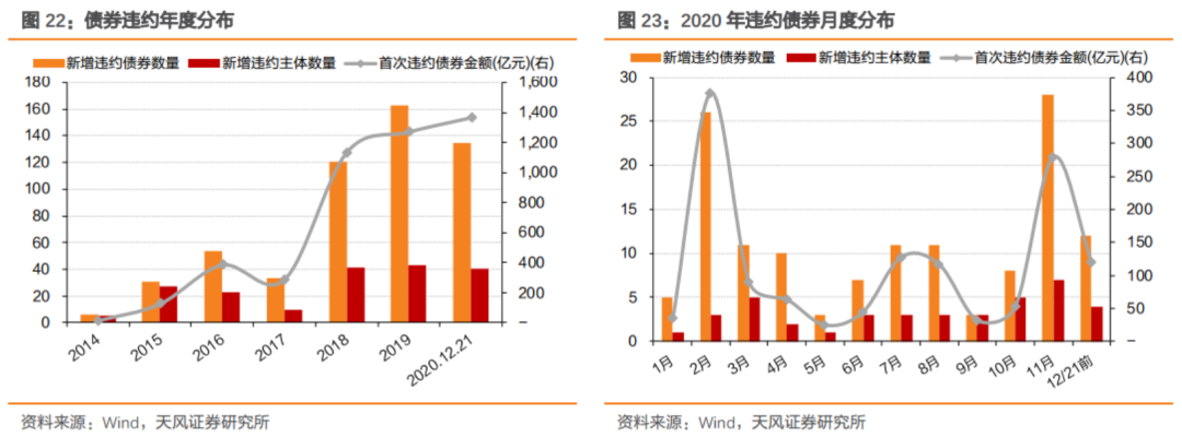 下半年货币、信用环境边际收紧,国企连续违约,信用风险持续暴露。沈公用、华晨、永煤、紫光等连续违约,尤其是永煤违约,对信用债市场冲击较大。2020年全年,市场新增信用债违约主体已经达到40家,仅略低于2019年的43家。
