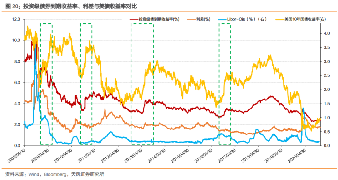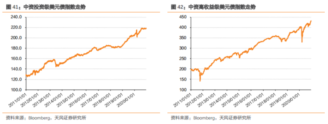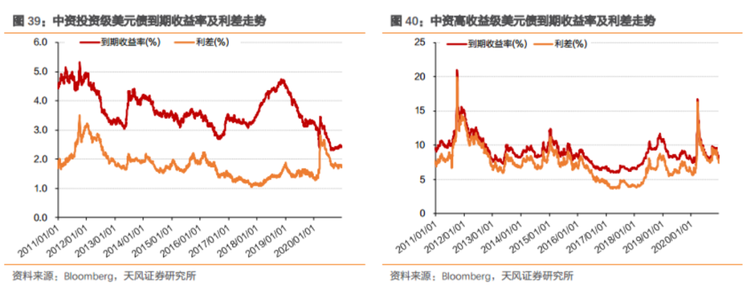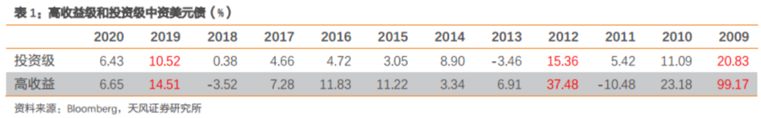 从历史来看,在市场大幅下行之后,往往都会有不错的投资回报。如2008年金融危机后的2009年,2010-11年欧债危机之后的2012年,2018年中美贸易摩擦后的2019年。这是中资美元债的债券属性,流动性外溢带来的资本利得增厚。