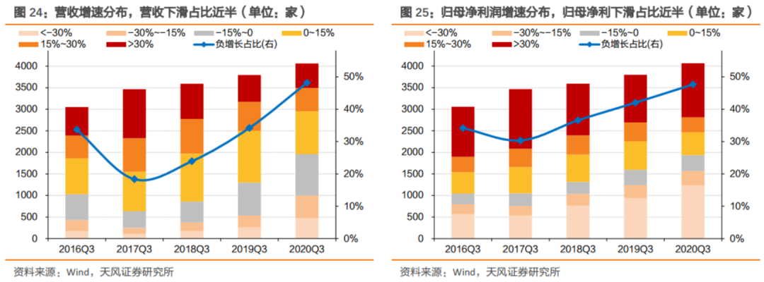 从上市公司基本面来看,业绩分化比较明显。2020年前三季度,A股上市公司营收下滑的企业占比达到所有上市公司的48.2%,归母净利润下滑的占比达到47.7%,疫情的冲击下大部分企业仍未完全恢复。业绩分化明显,归母净利润下滑30%以上的占比30.4%,相比2019年多了5.8%;而归母净利润上升30%以上的占比30.8%,相比2019年提高1.7%。
