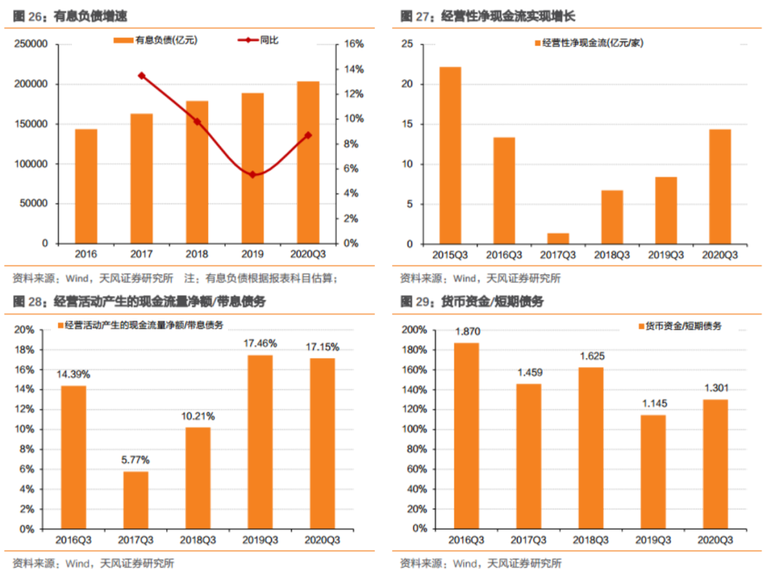 企业现金流、偿债能力小幅改善。从现金流来看,经营性现金流似乎并未恶化,从上市公司平均每家的经营性净现金流和经营活动产生的现金流量净额/带息债务来看,均未出现明显恶化。而从货币资金/短期债务来看,偿债能力甚至还略有提升。